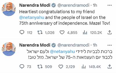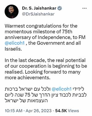 The other is Gen JFR Jacob, the key person who obtained an unconditional public surrender from the Pakistani Army at Dhaka. India congratulates Israel on its 75th Independence Day and wishes its people peace, progress and prosperity.