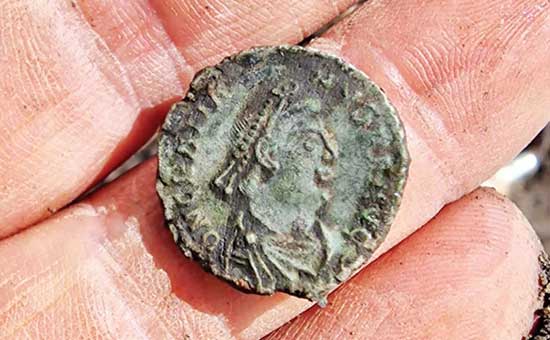 One of the coins discovered is believed to depict the Roman Emperor Valentinian I, who ruled from 364 to 375 AD. The team from Oxford Archaeology has also found evidence of farmsteads and settlements, including large rectangular enclosures evidenced by clear crop marks.